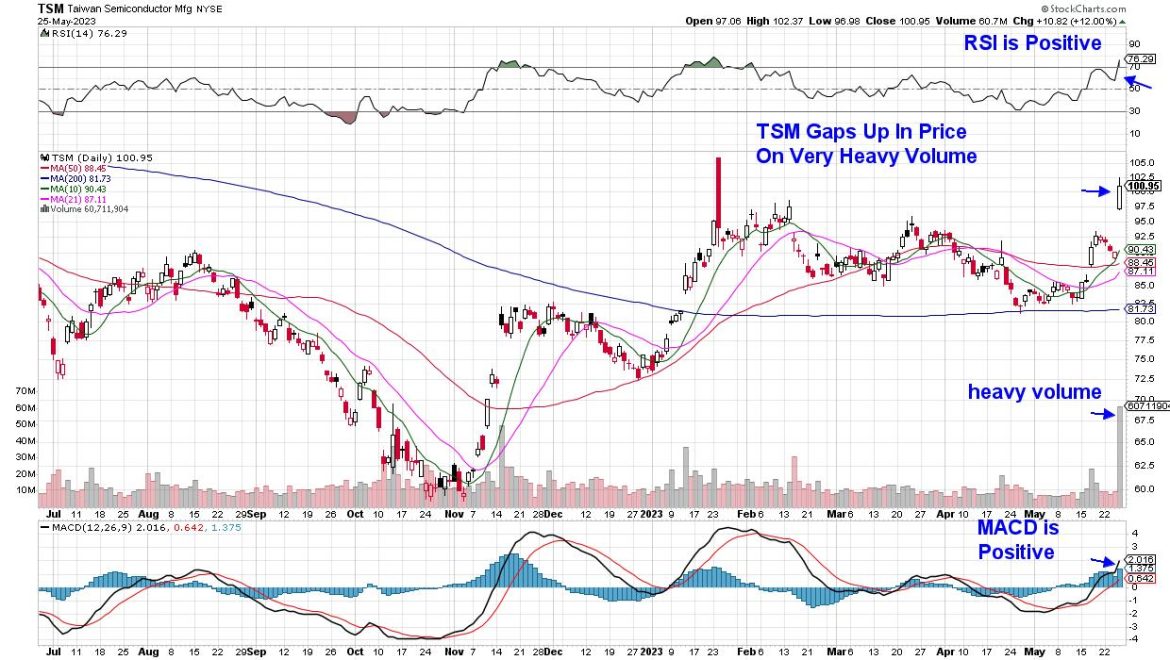 Taiwan Semiconductor (TSM) Gapped up 12% on very heavy volume today. The high volume indicates that the stock is being accumulated and it often points to further upside.